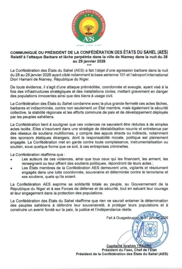 COMMUNIQUÉ DE LA CONFÉDÉRATION AES SUR L’ATTAQUE DE NIAMEY