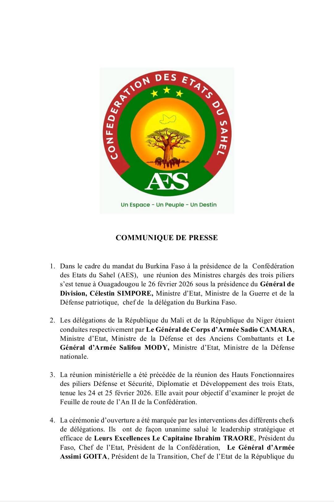 Communiqué de presse issu de la réunion des Ministres de la Confédération AES chargés des trois piliers sur l’examen et la finalisation du projet de feuille de route de l’an II de l’AES, tenue le 26 février 2026 à Ouagadougou.