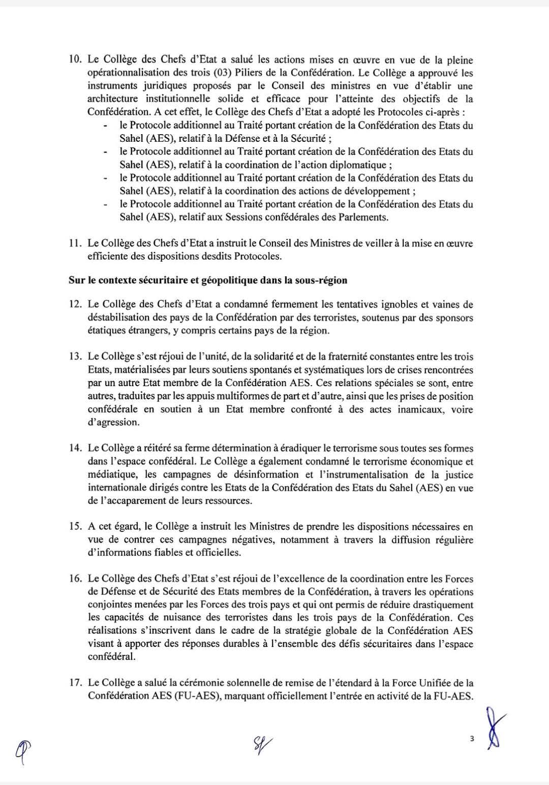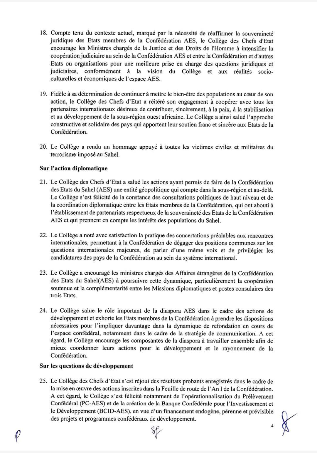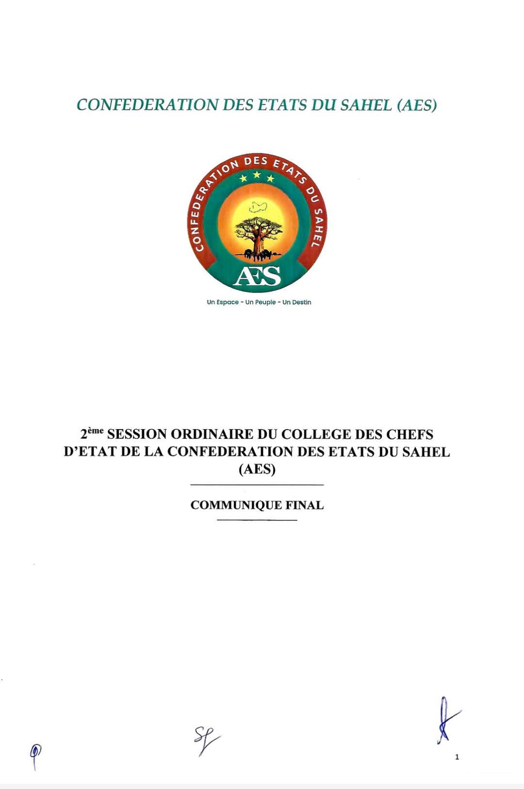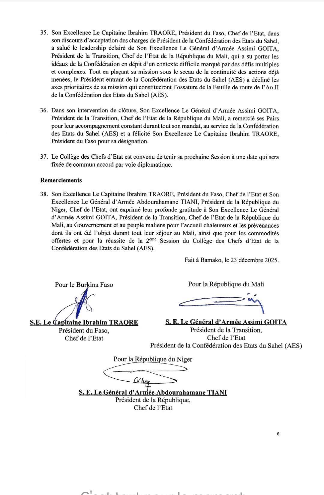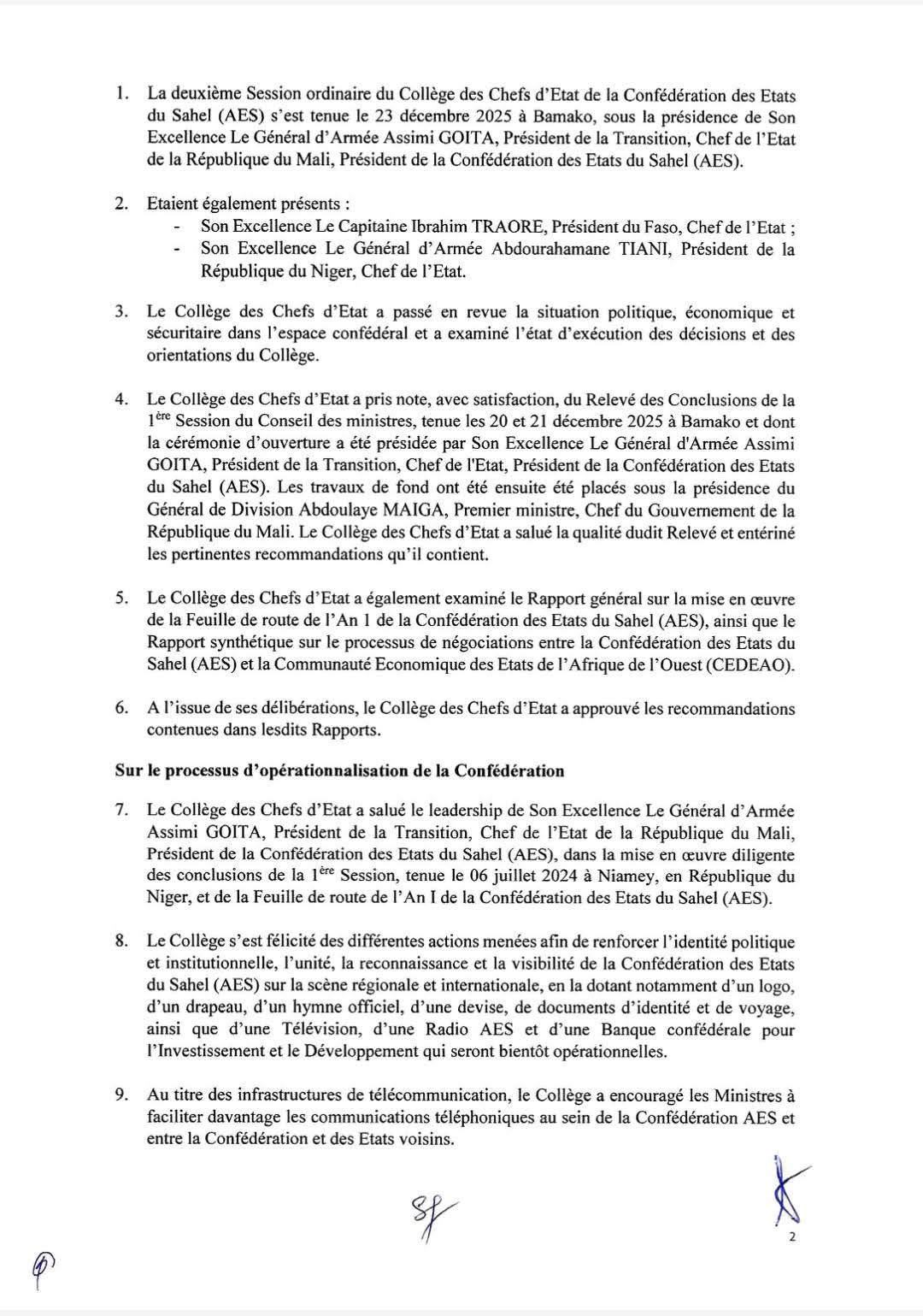 Communiqué final issu de la deuxième session ordinaire du Collège des Chefs d’État de la Confédération des États du Sahel (AES), Bamako, le 23 décembre 2025.