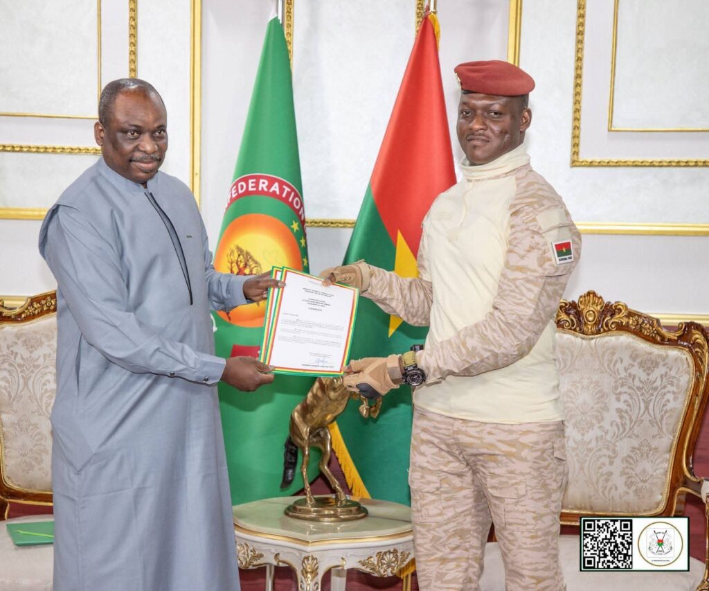 (Ouagadougou, 5 décembre 2025). Le Président du Faso, Chef de l’État, Son Excellence le Capitaine Ibrahim TRAORÉ, a reçu ce vendredi matin, les lettres de créance de l’Ambassadeur extraordinaire et plénipotentiaire de la République du Sénégal, Son Excellence Monsieur Papa DIOP.