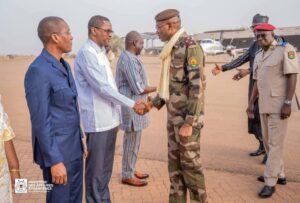 Le Général de Division Célestin SIMPORE était accompagné du Président de la Commission nationale AES Monsieur Bassolma BAZIE ; du ministre des Affaires étrangères, SEM Karamoko Jean Marie TRAORE ; du ministre chargé du Commerce, Monsieur Serge Gnaniodem PODA et du ministre délégué Madame Bêbgnasgnan Stella Eldine KABRE/KABORE.